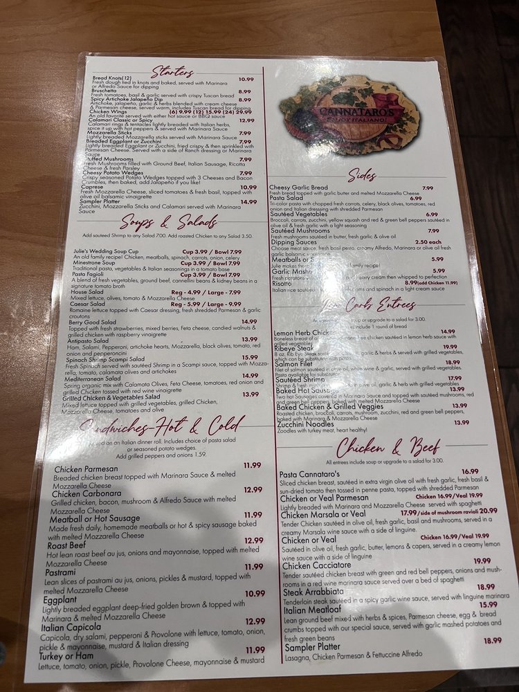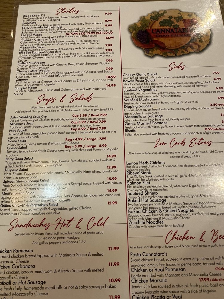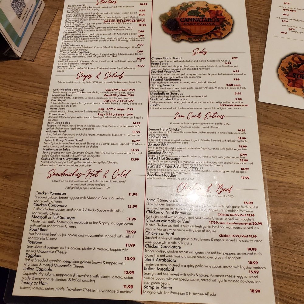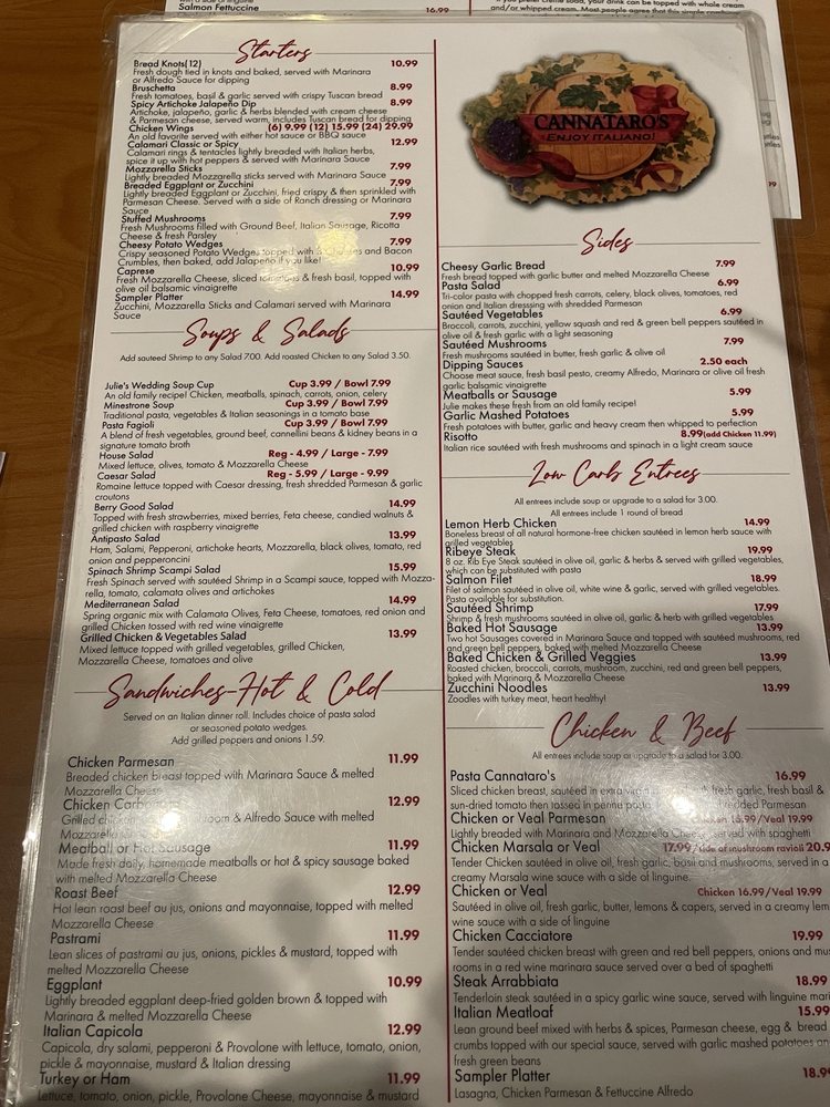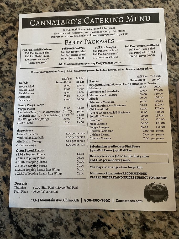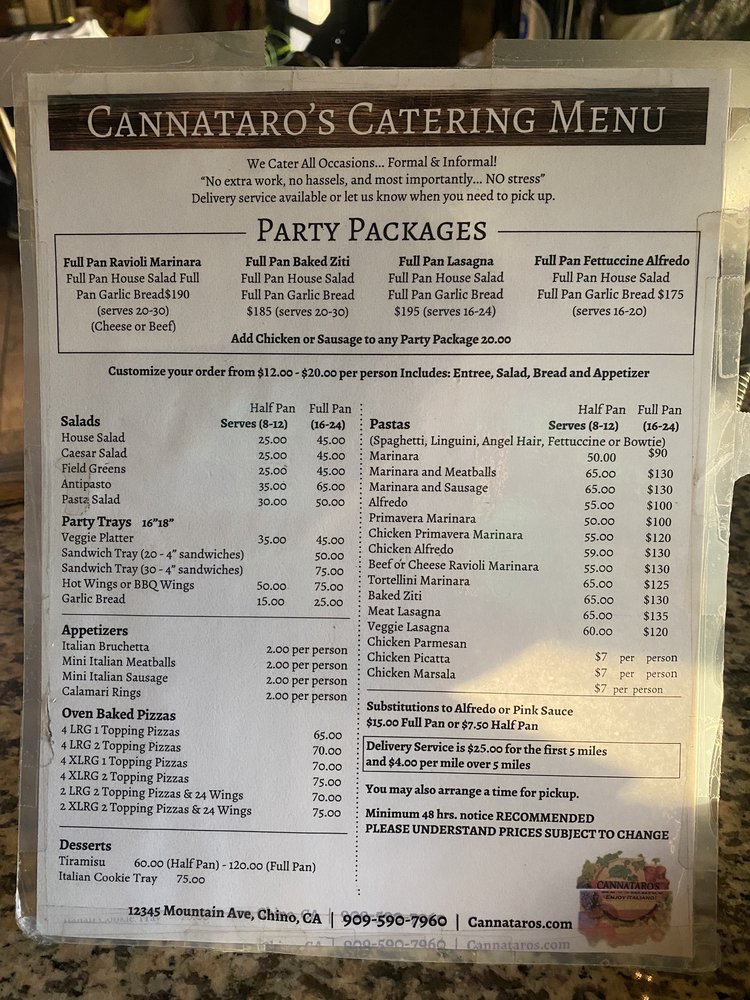 Introducing Cannataro’s Italian Restaurant, a hidden gem in Chino offering a diverse menu with vegan and vegetarian options. Located at 12345 Mountain Ave Ste K, this women-owned establishment provides a cozy atmosphere with attentive service. Start your meal with bruschetta or stuffed mushrooms, then savor a hearty soup like Julie's Wedding Soup or a classic Caesar salad. Indulge in the flavorful sandwiches like Chicken Parmesan or Roast Beef, paired perfectly with a bottle of wine. The enthusiastic reviews from customers reflect the quality of the food and service, making it a must-try for Italian cuisine lovers. Experience the authentic flavors of Italy at Cannataro’s and leave satisfied every time.